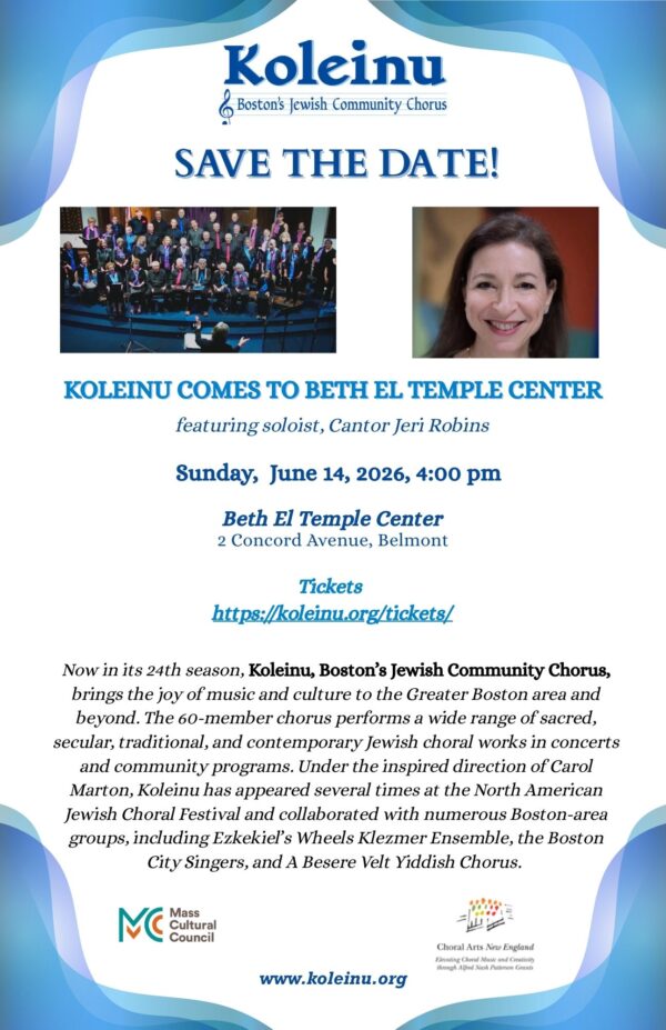 Koleinu, Boston’s Jewish Community Chorus, is a non-audition chorus open to all, and shares the rich heritage of Jewish music with diverse audiences through performance, collaboration, and participation in community and intercultural events. Koleinu provides its singers with the opportunity to experience the joy of musical expression and connect to the breadth of Jewish culture, liturgy and spirituality.